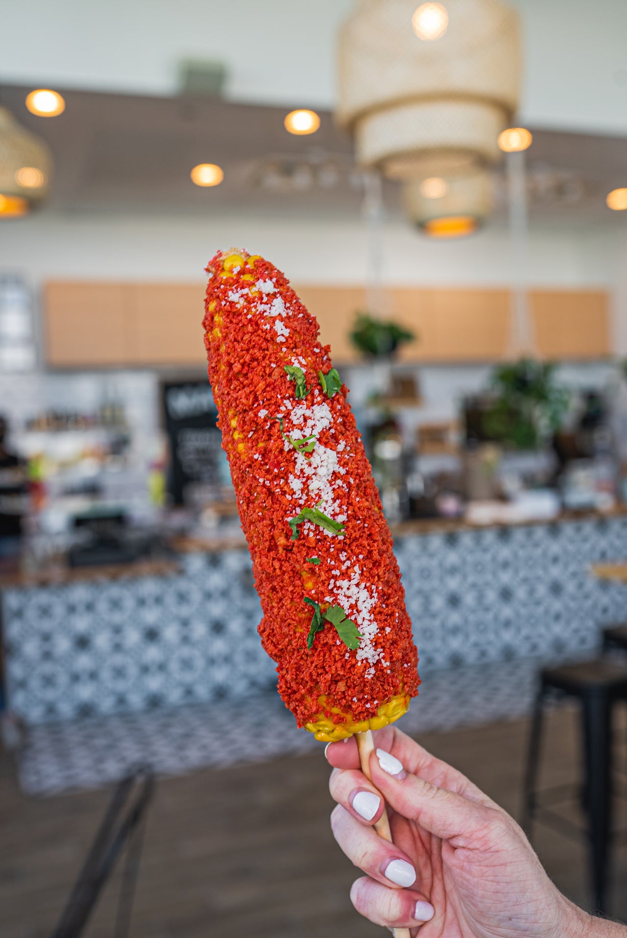 street corn, chili-lime mayo, takis, queso fresco, cilantro" GF